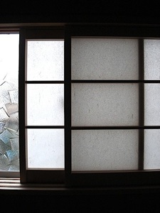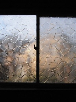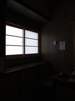 仕事机の後ろにある窓は古いアルミサッシに模様入りの型板ガラス。