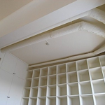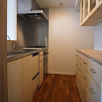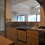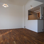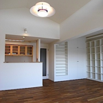 マンションによくある個室で仕切る間取りから、出来るかぎり間仕切り壁を取外し、広がりのある一間に。床は遮音性能を下地で確保し、仕上げはチークの無垢フローリング。壁はクロス(壁紙)の上からそのまま塗れるペンキ「Jカラー」塗装。 天井は最上階ということで断熱性能に優れた特殊セラミック断熱塗料「ガイナ」を左官で仕上げました。水廻りも製作キッチンを筆頭にユニットバス・トイレ・洗面とすべてをリフォーム。